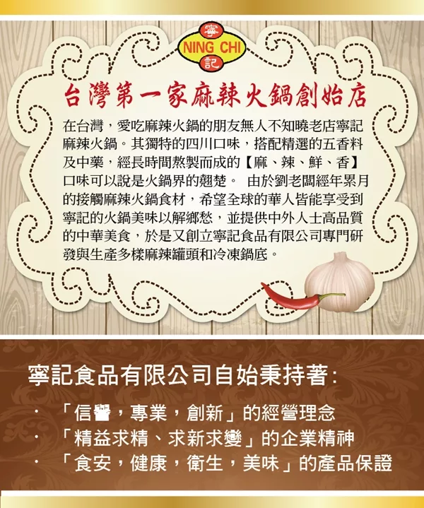台灣,愛吃麻辣火鍋的朋友無人不知無人不曉,【寧記】麻辣火鍋其獨特的四川口味,配合最好的五香料及中藥,長時燉製而成的麻辣口味,其口味麻、辣、鮮、香,在台灣可說無人能及。